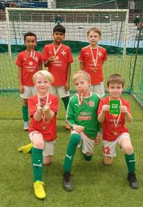 Valkoisen peliryhmän pelaajia välipäiväturnauksen mitalit kaulassa.